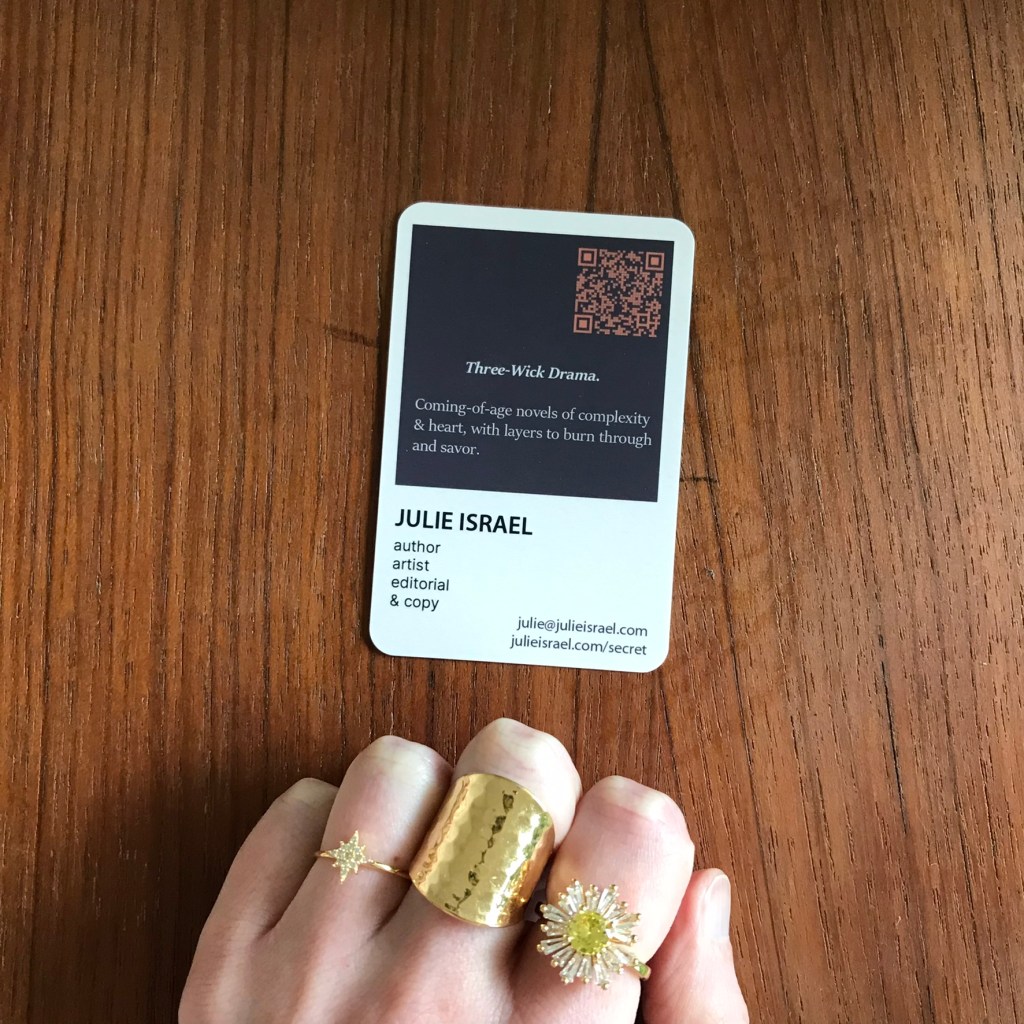 One caveat, however, is that “three-wick” implies, but does not expressly say “candle.” Which means that if someone doesn’t make the connection, the meaning could be lost. On my business card then, I add a little more: coming-of-age novels of complexity and heart, with layers to burn through and savor. This elaborates, while allowing the headline to remain crisp. Also, I figure it’s easy enough to say “like a good candle — stories to sink into” in the time it takes to hand someone my business card.