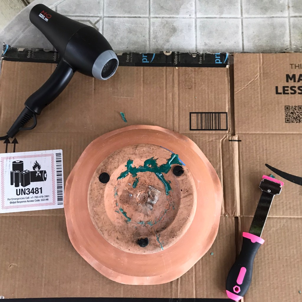 3. Choose your fill color. Determine whether you want to match the color of the vessel you’re repairing, or go for a pop color feature. Personally, I like the advice my Mom gave me: an attempt at a matched color usually looks like an attempt at a matched color, but choosing a different shade gives you the power to pivot for a unique, desired effect. So I did just that: Instead of trying to color-match my terracotta pot, I opted for a teal hue with a vision of creating an aged patina look.